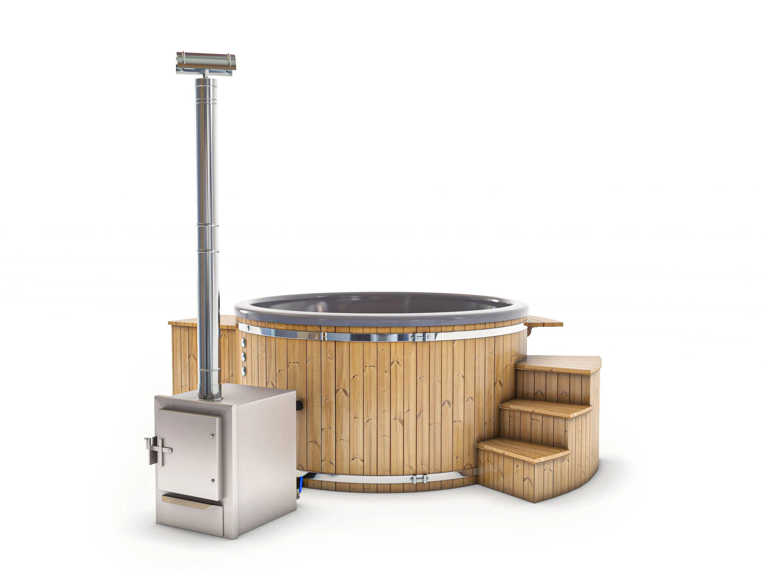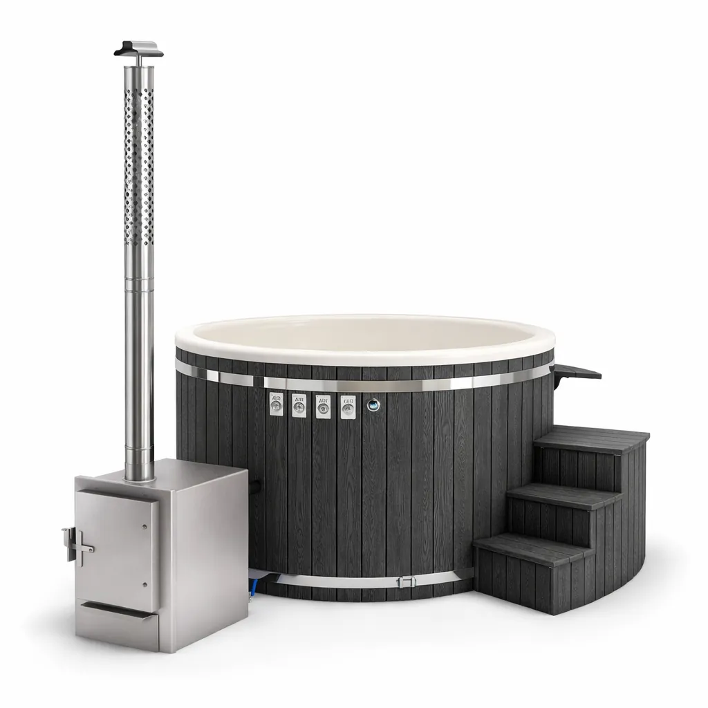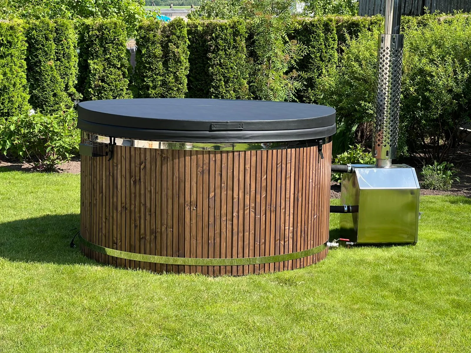Balia opalana drewnem Tarkine (EX) ma okrągły kształt i zewnętrzną średnicę 2 m. To praktyczny wybór do ogrodu dla rodziny lub grupy do 6 osób. Model nie ma dodatkowego siedziska dla dziecka. Do ogrzewania możesz wybrać zewnętrzny piec opalany drewnem albo zestaw łączony, czyli piec na drewno z wbudowaną grzałką elektryczną. Drewno pozwala szybciej podgrzać wodę, natomiast grzałka ułatwia utrzymanie temperatury bez konieczności częstego dokładania opału podczas kąpieli.